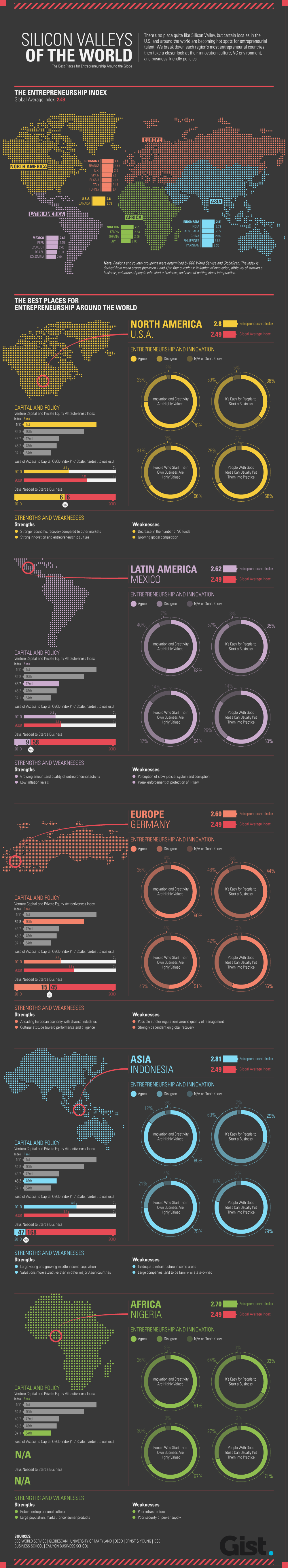 The infographic goes further by listing down weaknesses and strengths of the tech hotspots in focus, including details such as Venture Capital and Private Equity Attraction Index. It also shows you how many days (on average, I suppose) it takes to get a business up and running. Indeed, this infographic can be very useful for those who are serious about creating something that may very well be the next big thing.
